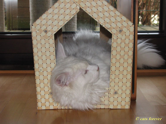 Also ehrlich...da muß sich so ein stattlicher Maine Coon Kater wie ich in so eine kleine Hütte quetschen. Möchte mal wissen, was sich meine Dosis beim Kauf gedacht haben. Tse, tse, tse!! Ich halte ihnen mal zugute, dass sie zu dem Zeitpunkt noch nicht wußten, das ich mal hier einziehen werde ;-